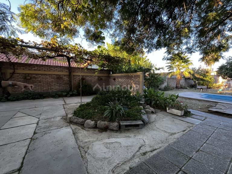 Con un piso de tierra y mirando hacia arriba con un cielo transparente como techo, caminando varios metros por el patio hacia el interior del terreno vemos al frente que se levanta una hermosa CASA QUINCHO de dos plantas de 128 m2 de superficie total. a un costado, atrae nuestras miradas una pileta de natación, árboles frutales, pasto y tierra conforman este lindo patio.